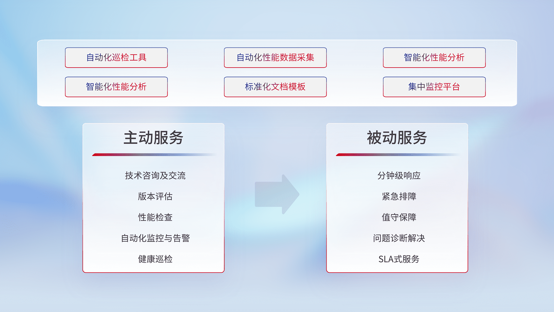 智能化工具和标准化文档,,,,保障服务质量,,提供主动服务(包含技术咨询、、、版本评估、、、性能检查、、、自动化监控与告警、、、健康巡检)和被动服务包含(分钟级响应、、、、紧急排障、、值守保障、、、问题诊断解决、、、SLA服务)。。
